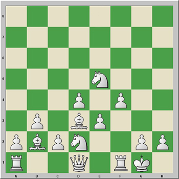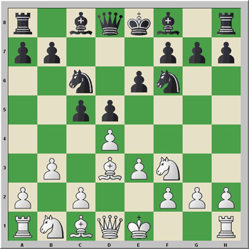 1.d4 Cf6 2.Cf3 d5 3.e3 e6 4.Ad3 c5 5.b3 Cc6 6.0-0 Ad6 7.Ab2 0-0 8.Cbd2 De7 9.Ee5 cxd4 10.exd4 Aa3