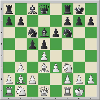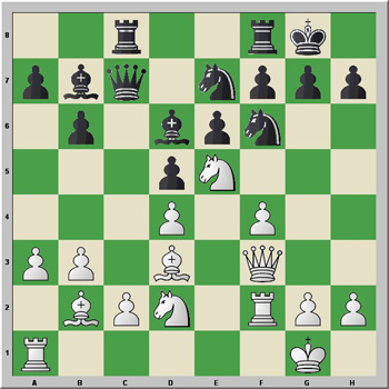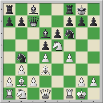 1.d4 Cf6 2.Cf3 e6 3.e3 c5 4.Ad3 d5 5.b3 Cc6 6.O-O Ad6 7.Ab2 O-O 8.Ce5 Dc7 9.f4 cxd4 10.exd4 Cb4 11.Cc3 Cxd3 12.Dxd3 Ad7 13.Tf3 Tfc8